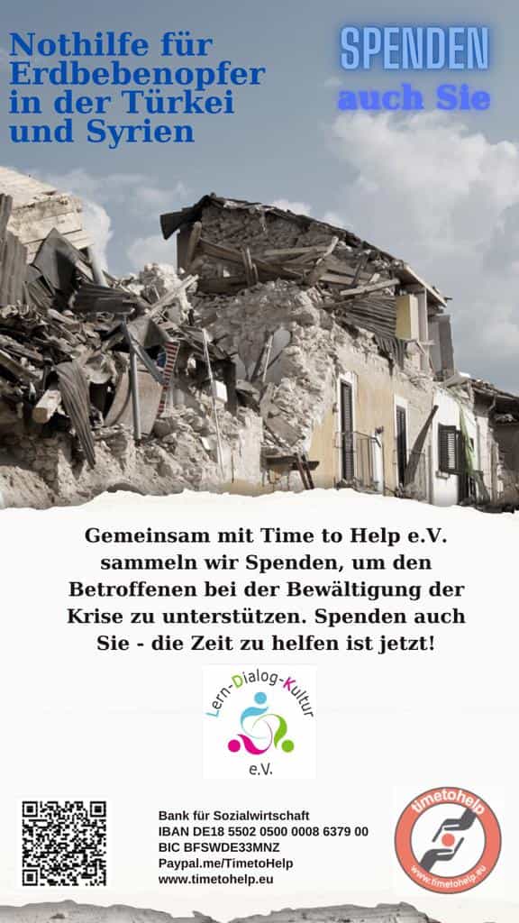News Home . News Erdbeben in der Türkei und Syrien Die Türkei und Syrien haben stark unter den Erdbeben gelitten.Wir sind in großer Trauer. Tausende Überlebende kämpfen mit Kälte und Winterbedingungen.Um sie zu unterstützen, haben wir gemeinsam mit dem Verein Time To Help eine Charity-Aktion gestartet.Bitte lasst uns sie gemeinsam unterstützen. https://paypal.me/timetohelp